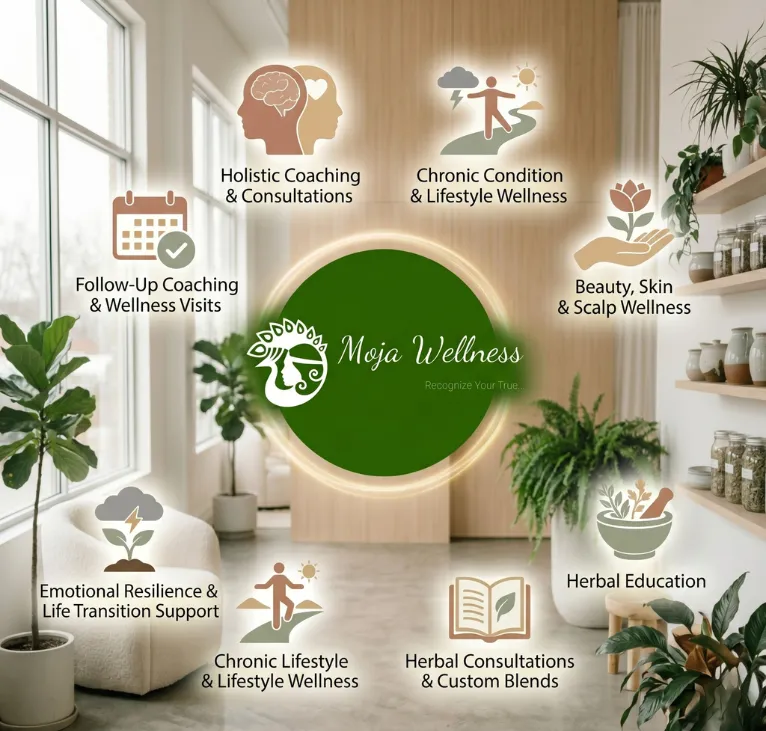 At Moja Wellness, we provide curated, holistic wellness experiences designed to nurture your mind, body, and spirit. From personalized coaching and therapeutic bodywork to herbal education and signature high-touch programs, every service is tailored to support lasting balance, vitality, and emotional resilience.